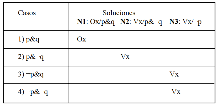 Este sistema es completo y coherente. Sin embargo, la completitud no se preserva en un universo de casos menos fino, por ejemplo, el universe de casos formado por {p,¬p}. En este universo de casos, el caso genérico p está correlacionado con una disyunción de soluciones, i.e. p está correlacionada con la disyunción Ox o Vx. Afirmar p es equivalente a afirmar ((p&q) ∨ (p&¬q)). Dado que el primer miembro de la disyunción está correlacionado con Ox y el segundo miembro con Vx, se sigue que p está correlacionado con una disyunción de soluciones. Una disyunción de soluciones no es una solución y, por ello, p carece (parcialmente) de solución.